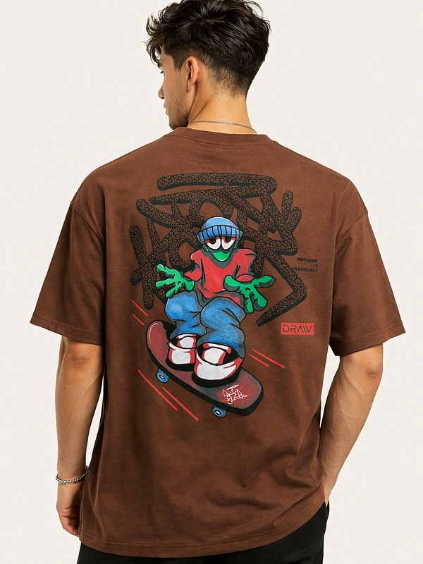 SEO Meta: Brown Skater Tee, Alien Graphic Oversized T-shirt, Storm Valor Brown Streetwear, 240 GSM Cotton.