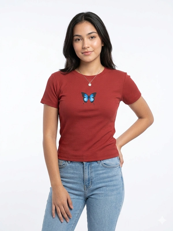 Storm Valor Maroon Ribbed Knit Top | Blue Butterfly Embroidery Style | 160 GSM Soft Polycotton